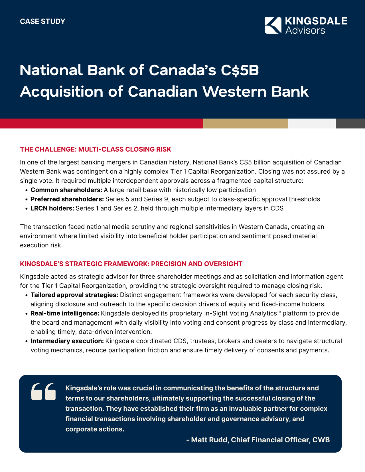 That reality defined National Bank of Canada’s C$5 billion acquisition of Canadian Western Bank, which required approvals across common shares, preferred shares, and LRCNs as part of a Tier 1 Capital Reorganization. Kingsdale Advisors delivered strategic oversight and real‑time voting intelligence, securing common shareholder approval, approval across preferred share classes, and mitigating closing risk through disciplined, class‑specific execution.